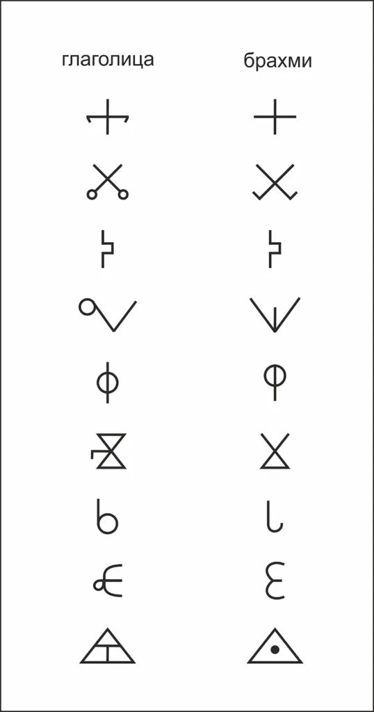 Част от знаците на глаголицата са сходни с букви от писмеността брахми: