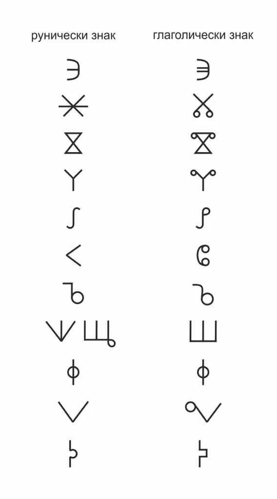 Съществува известна визуална прилика между някои глаголически знаци и букви от други азбуки – финикийската, арамейската, палмирската, староеврейската и коптската. Особено силна е приликата със знаци от българската руническа писменост: