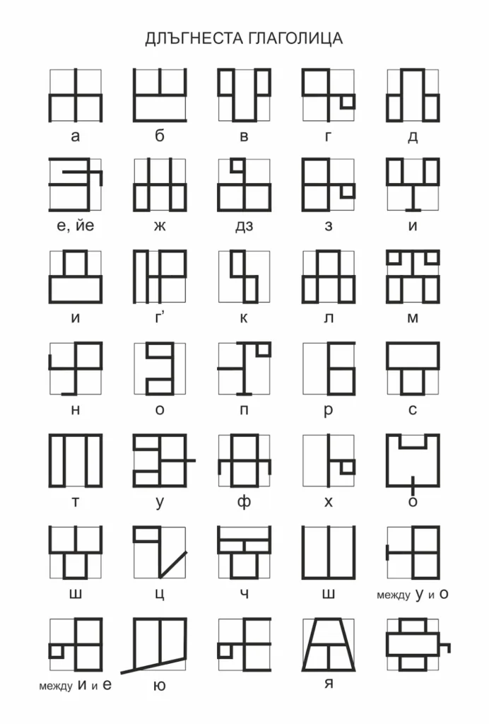 2. Длъгнеста глаголица, наричана още „хърватска“ или „далматинска“: